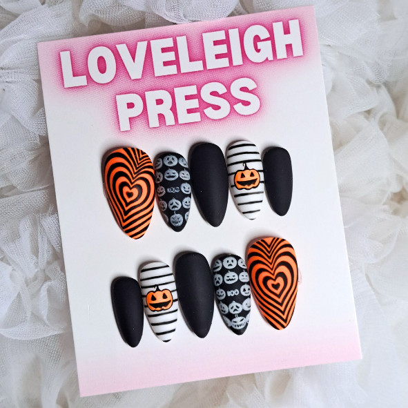 Black white and orange spooky season nails with heart and stripe patterns decorated with Jack-o-lantern nail art.