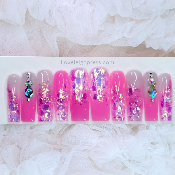 Hot pink jelly nails with encapsulated aroura glitter and AB crystals rhinestones