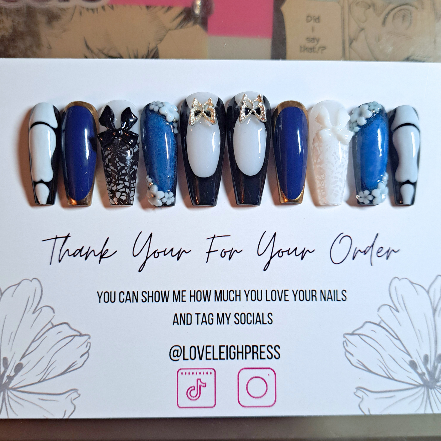 Corpse bride inspired nails with lace/bones nail art bow/butterfly charms and gold chrome accents