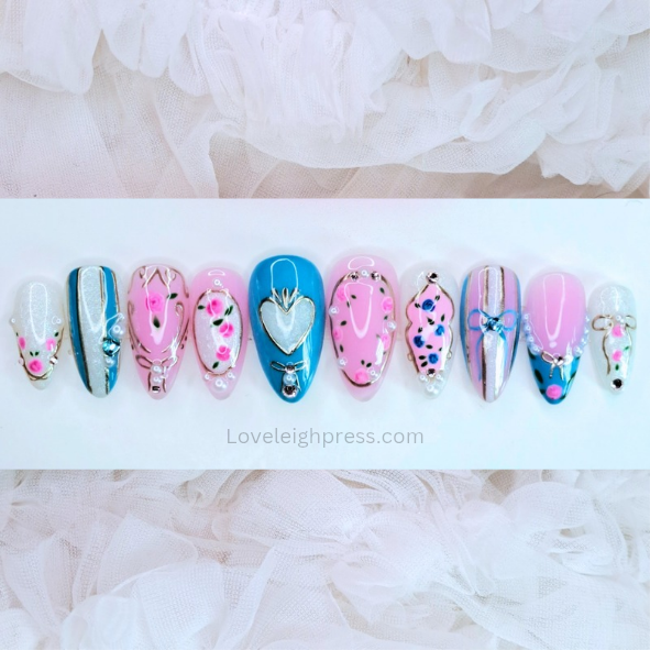 Bridgerton inspired coquette nails with shimmer chrome swirls gold chrome and roses nail art.