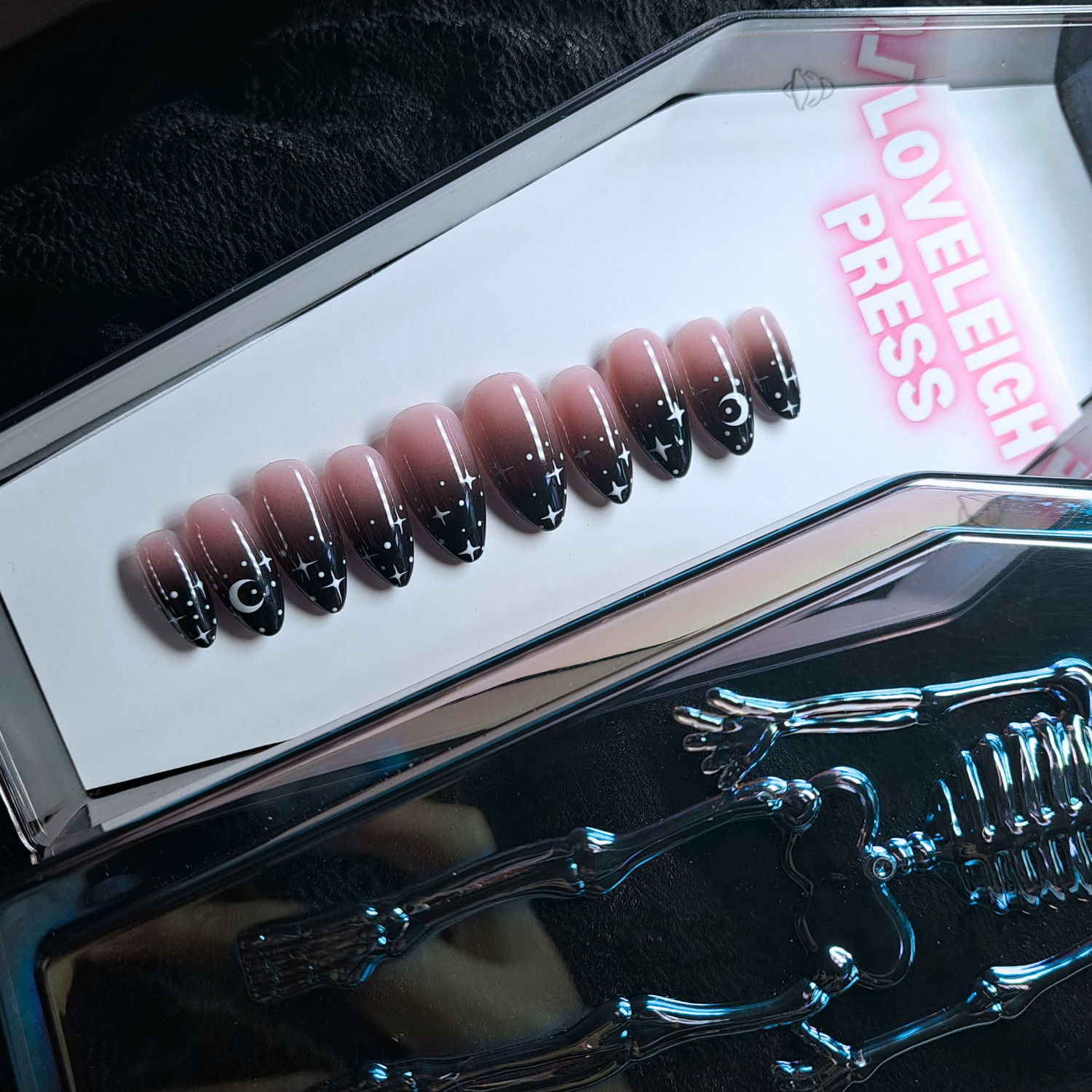 Black ombre nails with white star and moon nail art. (Coffin case not included)