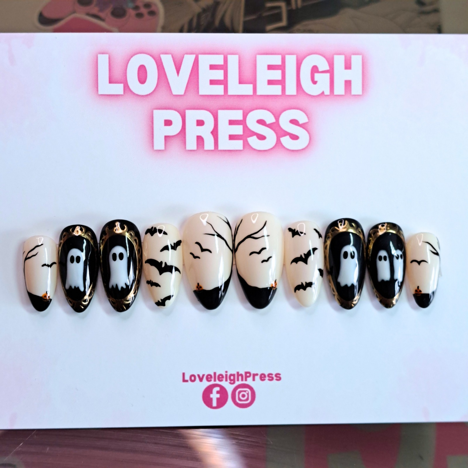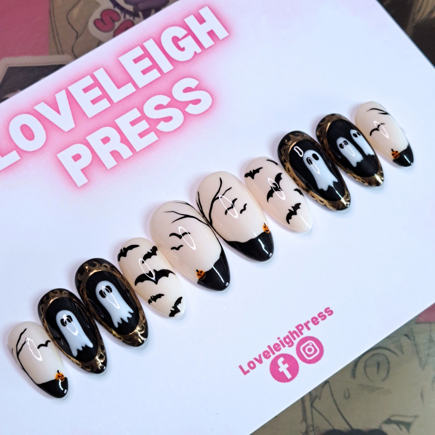 Cream white nails with spooky tree and ghost nail art with antique style gold chrome frames