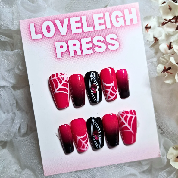Deep magenta and black ombre nails with white web nail art and 3d rhinestone spiders.